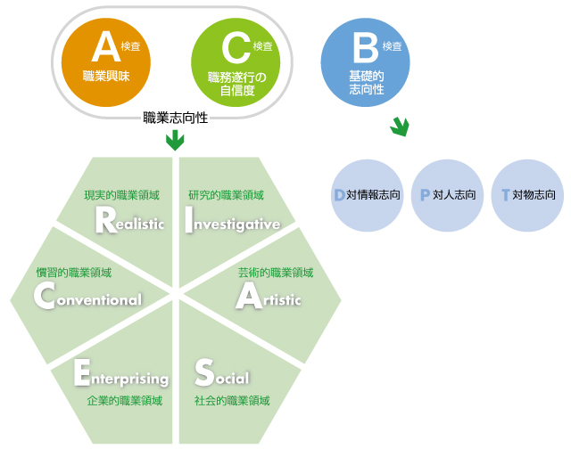 アメリカの心理学者J. L. ホランドによって類型化された6つの職業領域(現実的、研究的、 芸術的、社会的、企業的、慣習的)への興味・自信と3方向の日常行動特性(対情報、対人、対物)から、職業興味と職務遂行に関する自信度、基礎的志向性の特徴がわかります。
