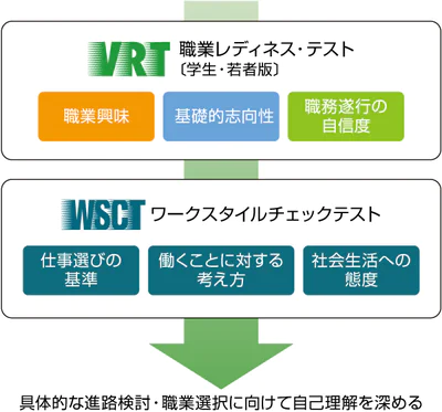 就職支援やキャリアカウンセリング等でご活用いただけます。 VRT〔学生・若者版〕は、大学・短大・専門学校等の高等教育課程の在学者や、30代前半程度までの若年求職者を対象としています。
