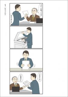 系列画は、日常よく見かける場面を時系列に沿って4コマ画で表したものです。