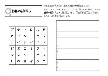 マスの仮名の中から、縦方向(↓)横方向(→)斜め向(→→)に、重ならずに書かれている単語を探す教材です。